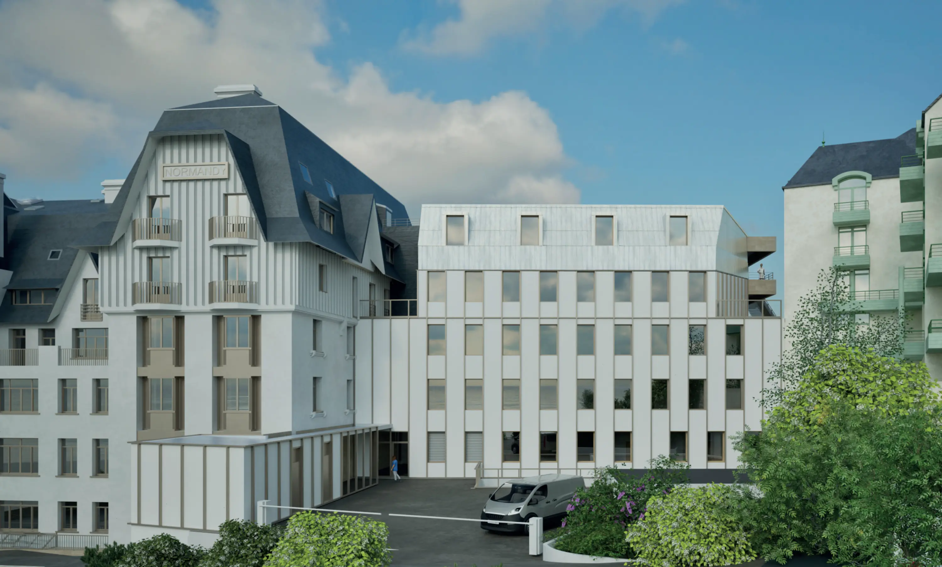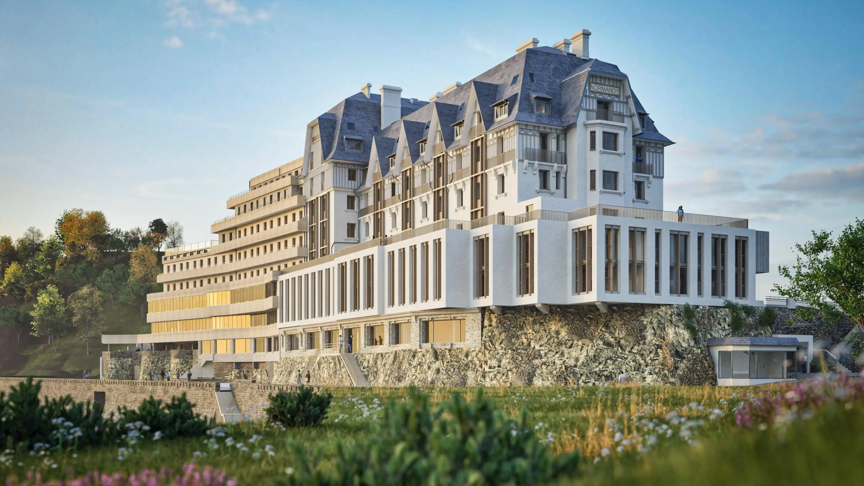 Le Normandy 1, établissement SMR de 160 lits en bord de mer à Granville. Le bâtiment fera l’objet d’une restructuration complète, intérieure et extérieure, menée en site occupé. Cette opération ambitieuse modernise les espaces avec des plateaux techniques modernes, optimise les surfaces et renforce l’attractivité et l’excellence en réadaptation, tout en garantissant la continuité des soins dans un cadre privilégié.
